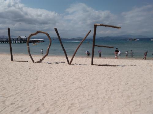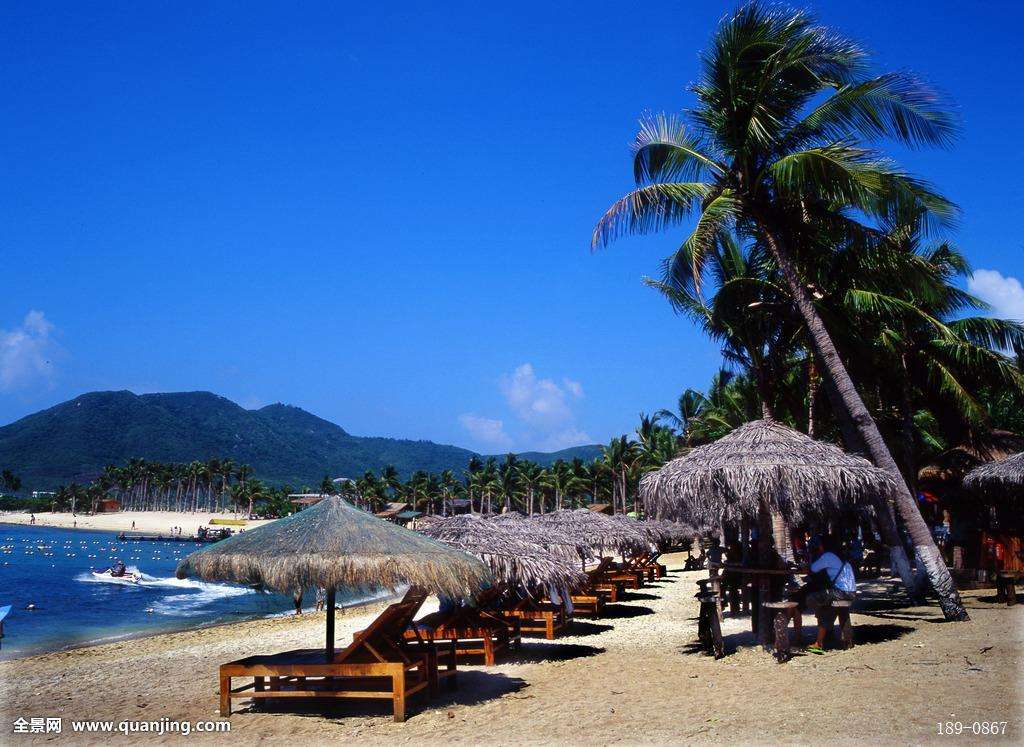 蜈支洲岛号称中国的“马尔代夫”, 沙滩洁白细腻,海水清澈见底。此处画面呈现:海如蓝、绿如镜、白如雪,山