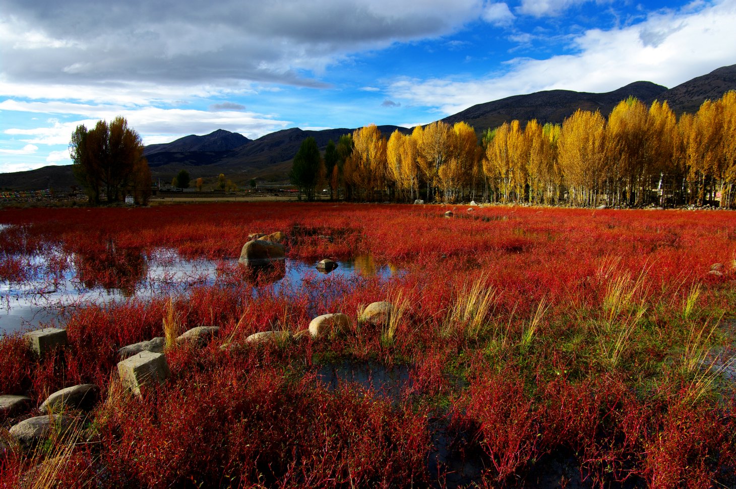 红草地:位于四川省甘孜州稻城县,极目远望,一片红彤彤的景致映入我的眼帘,红得那么热烈,那么艳丽,也那么醉人。在或黄或绿的白杨树的衬托下,灿灿生辉,妩媚无比。近视,"山青心欲燃,红树醉秋色",我们徜徉在公路畔的小村庄,"红草地"在阳光下奏鸣着令人陶醉的红色旋律,真想套用唐代诗人杜牧的千古名句,也喊出一句"停车坐爱红草地,霜叶红草十月花